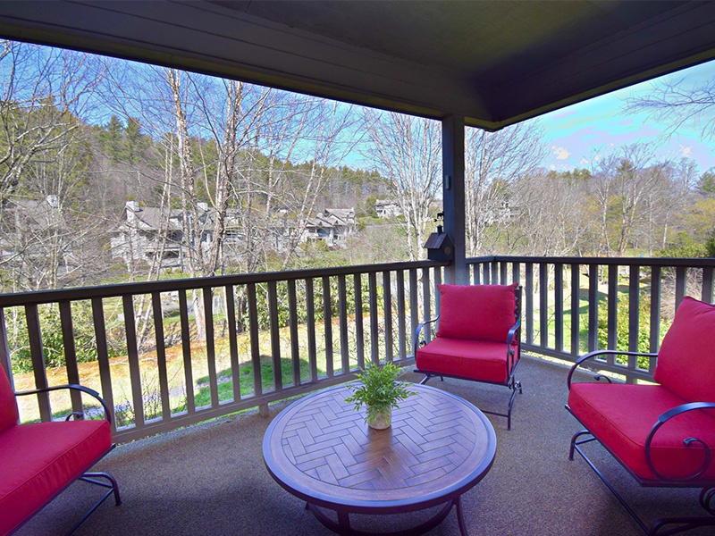 Private balcony with 4 chairs and a coffee table overlooking the woods and stream