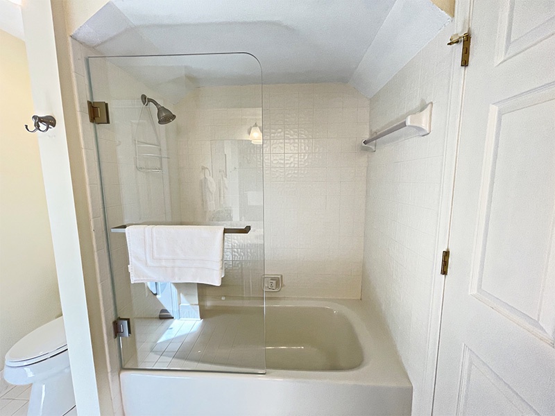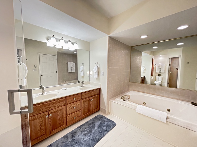Primary Bedroom: King bed, 42" flat-screen TV, ensuite bath with two-person whirlpool tub + standing shower
