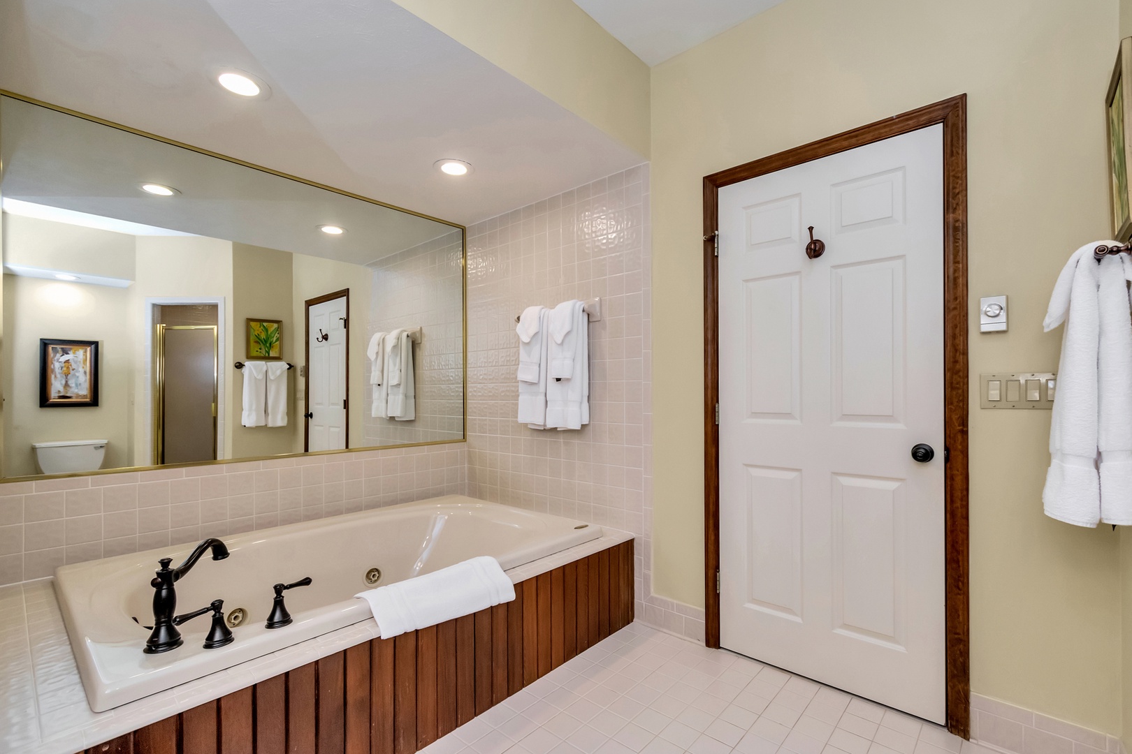 Primary Bedroom: King bed, flat-screen TV/DVD, end suite with two-person whirlpool tub + standing shower