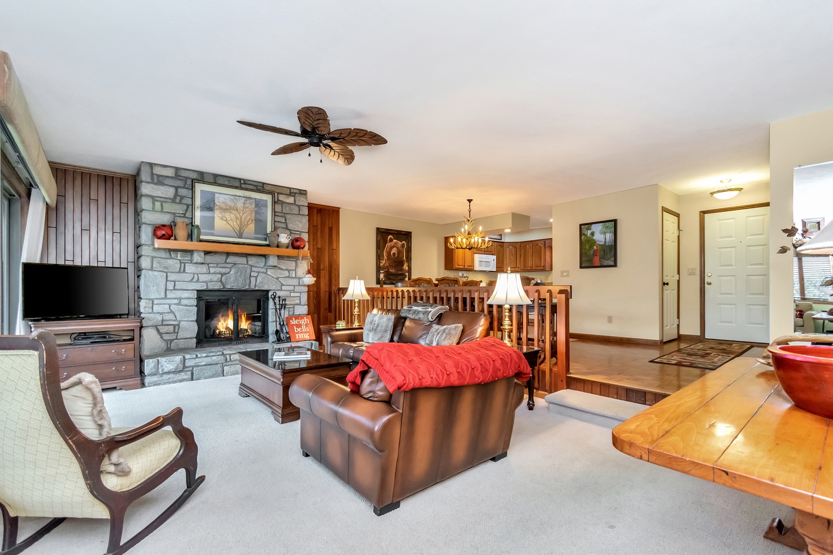 Living Room: Queen-size sleeper sofa, wood-burning fireplace, large flat-screen TV/DVD
