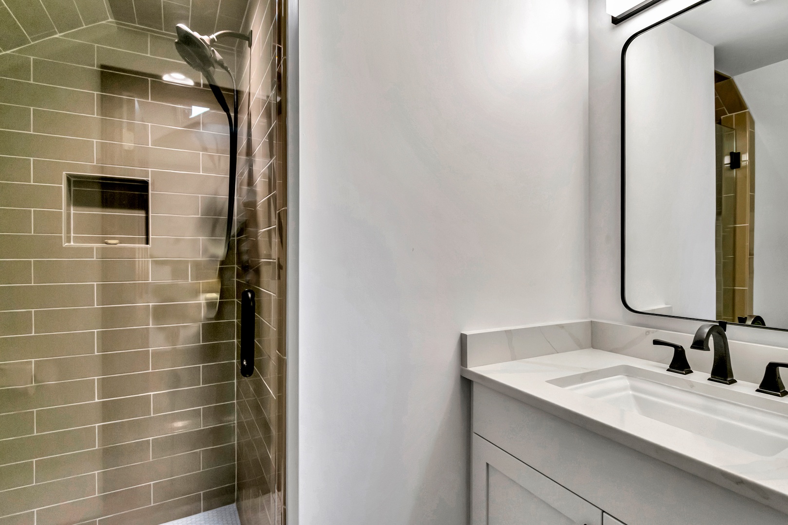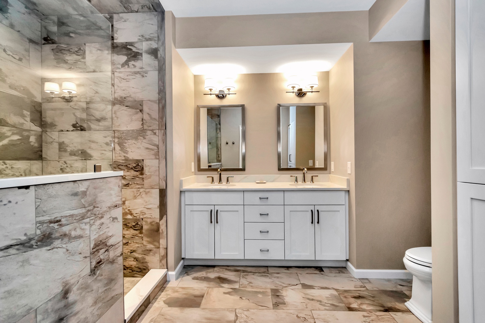 Main Level Primary Bedroom: King bed, 42” flat-screen TV, ensuite with tiled walk-in rain shower and dual-sink granite vanity