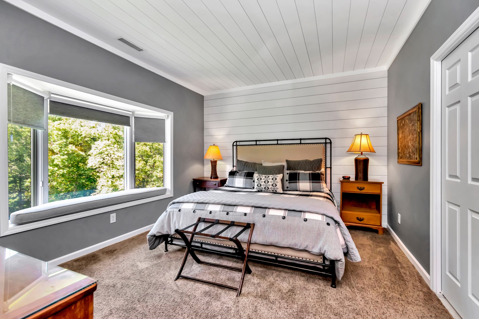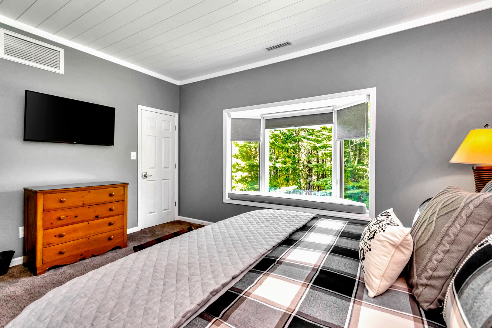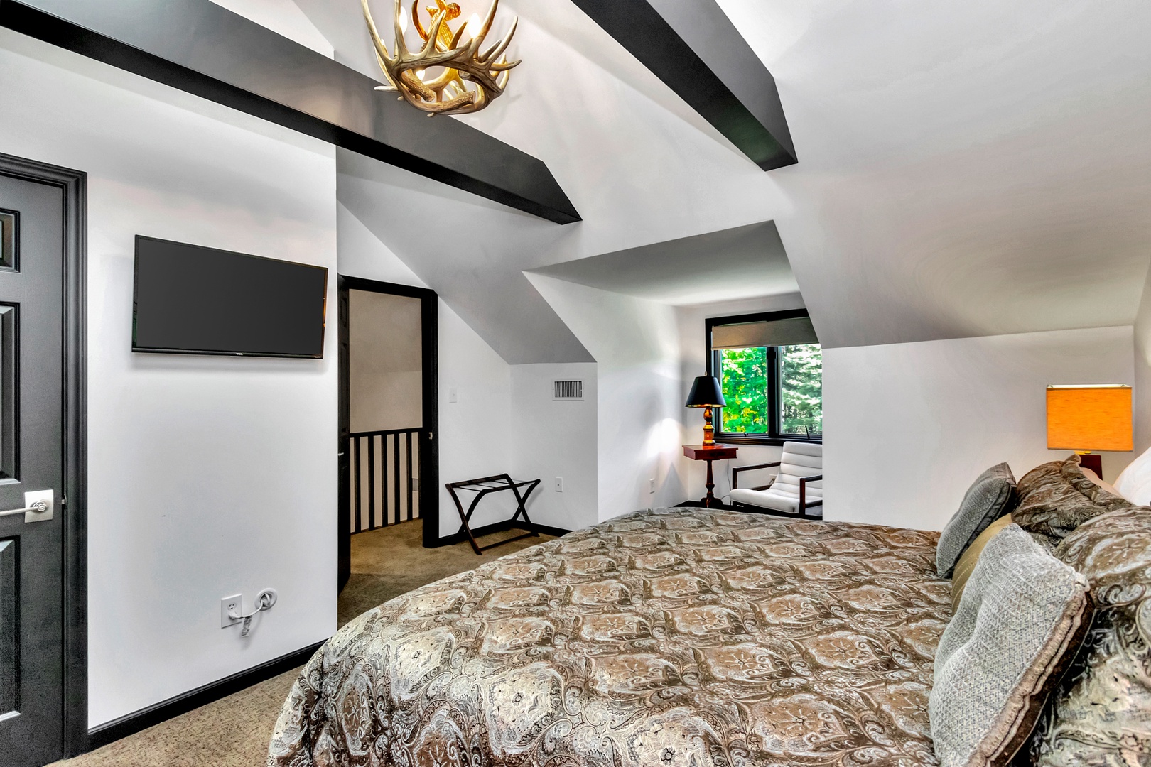 Main Level Guest Bedroom: Queen bed, 42” wall-mounted flat-screen TV, adjacent full bath