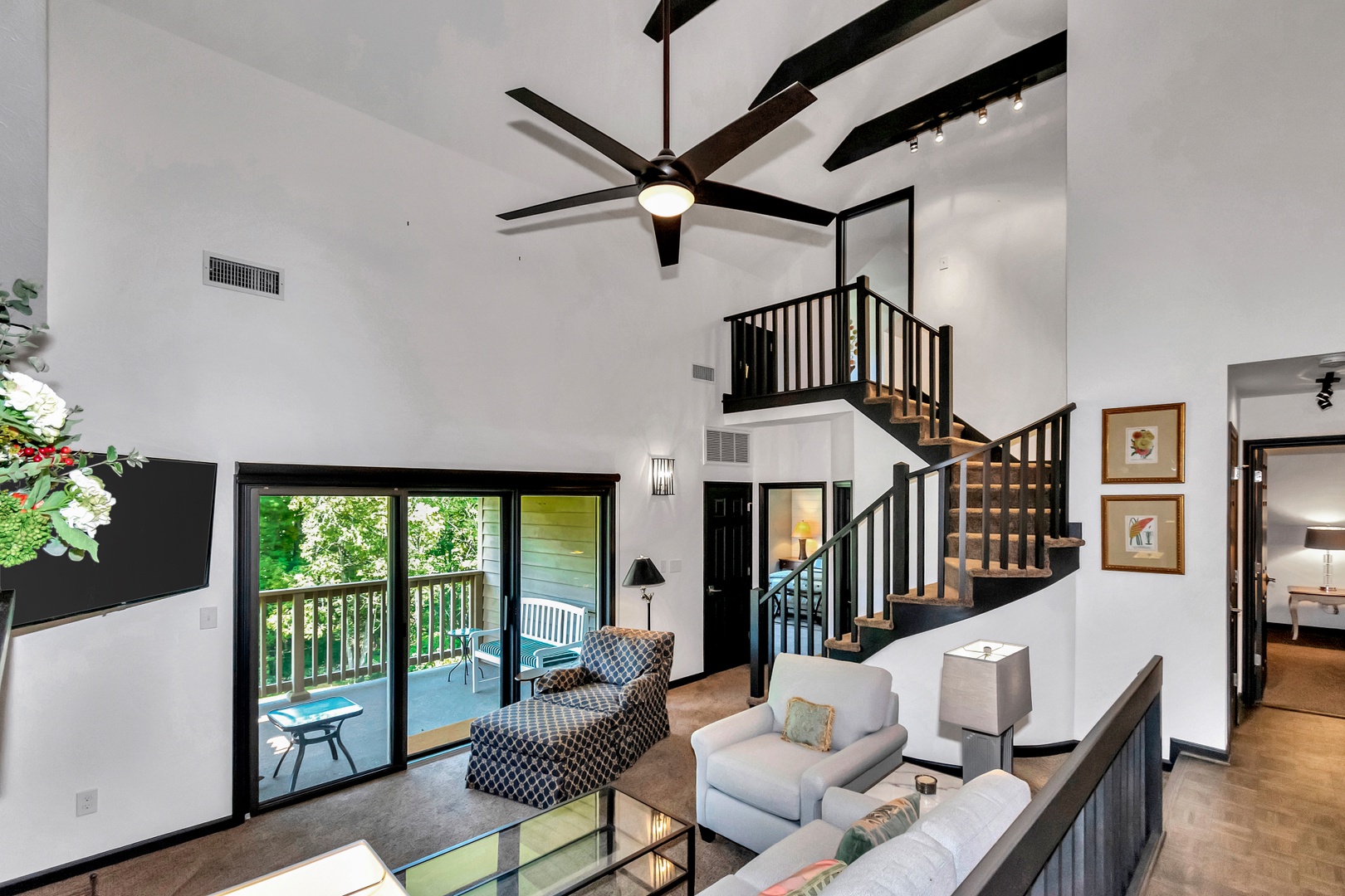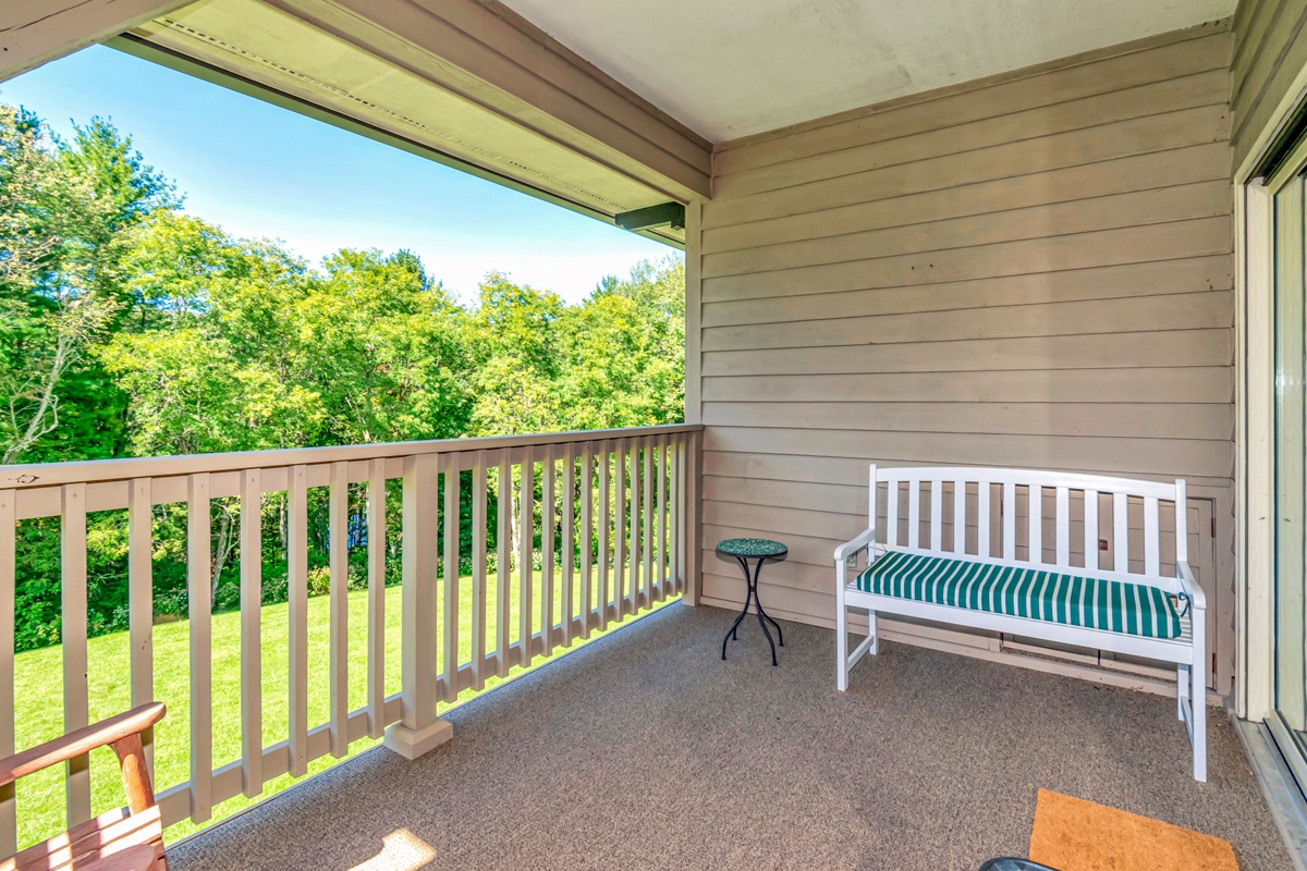 Private balcony with rocking chairs and park bench overlooking the woods
