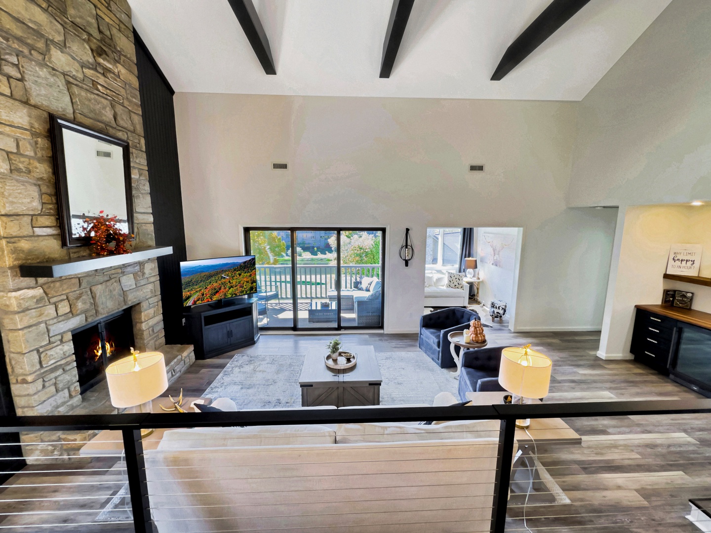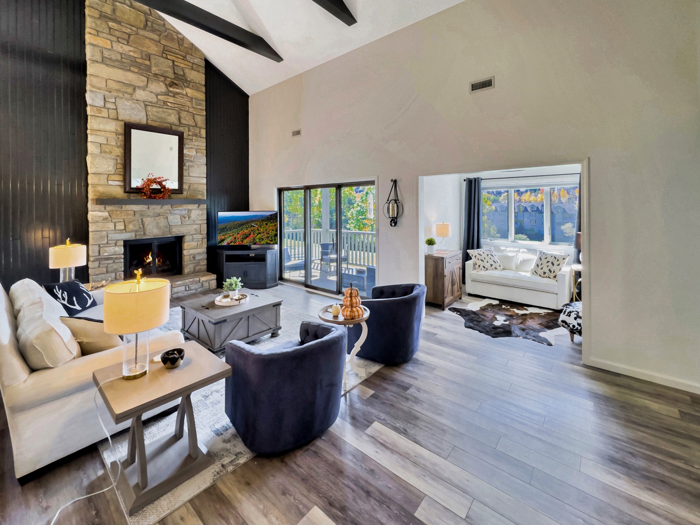 Spacious living room with flat-screen TV and cozy gas fireplace