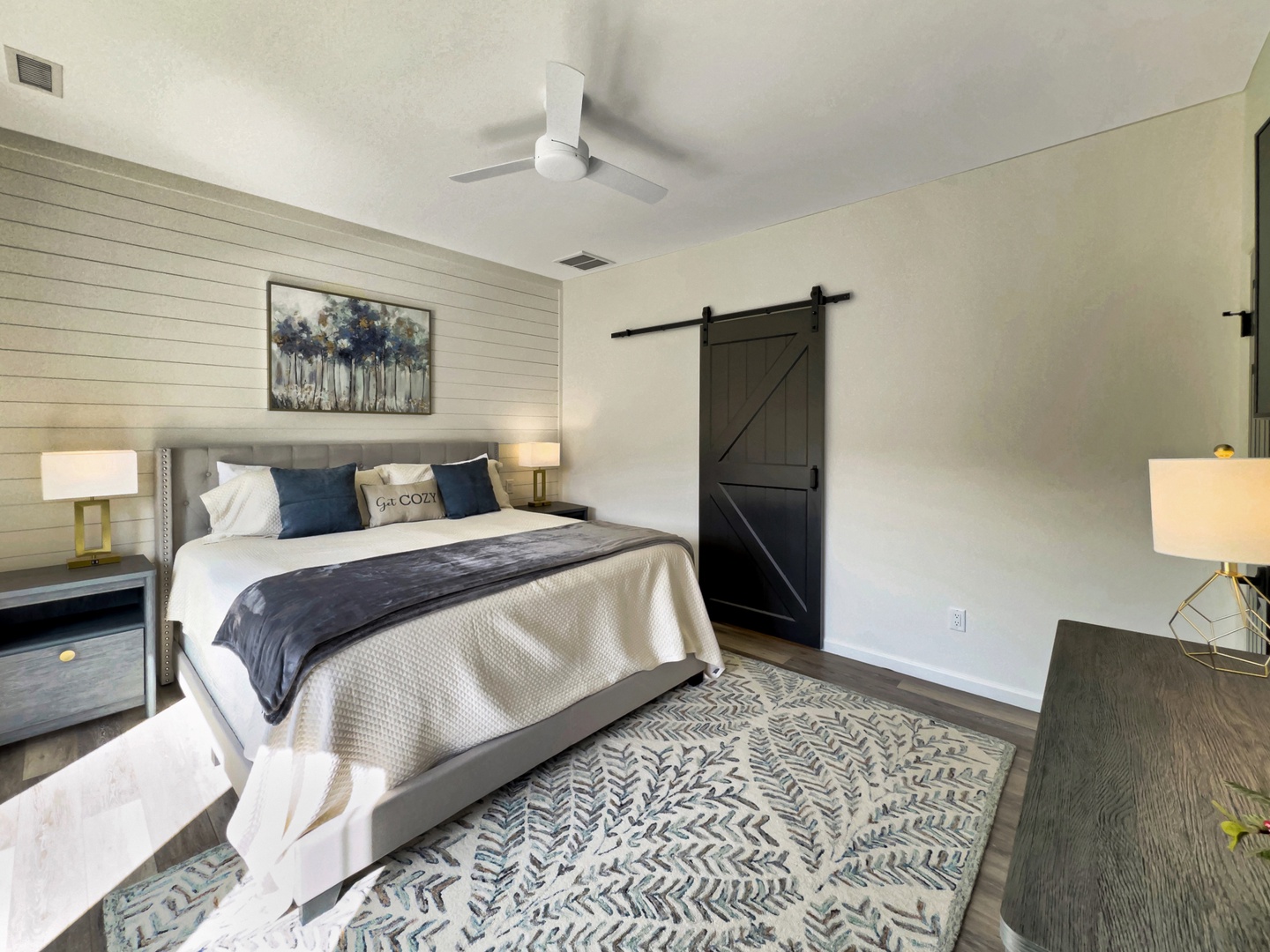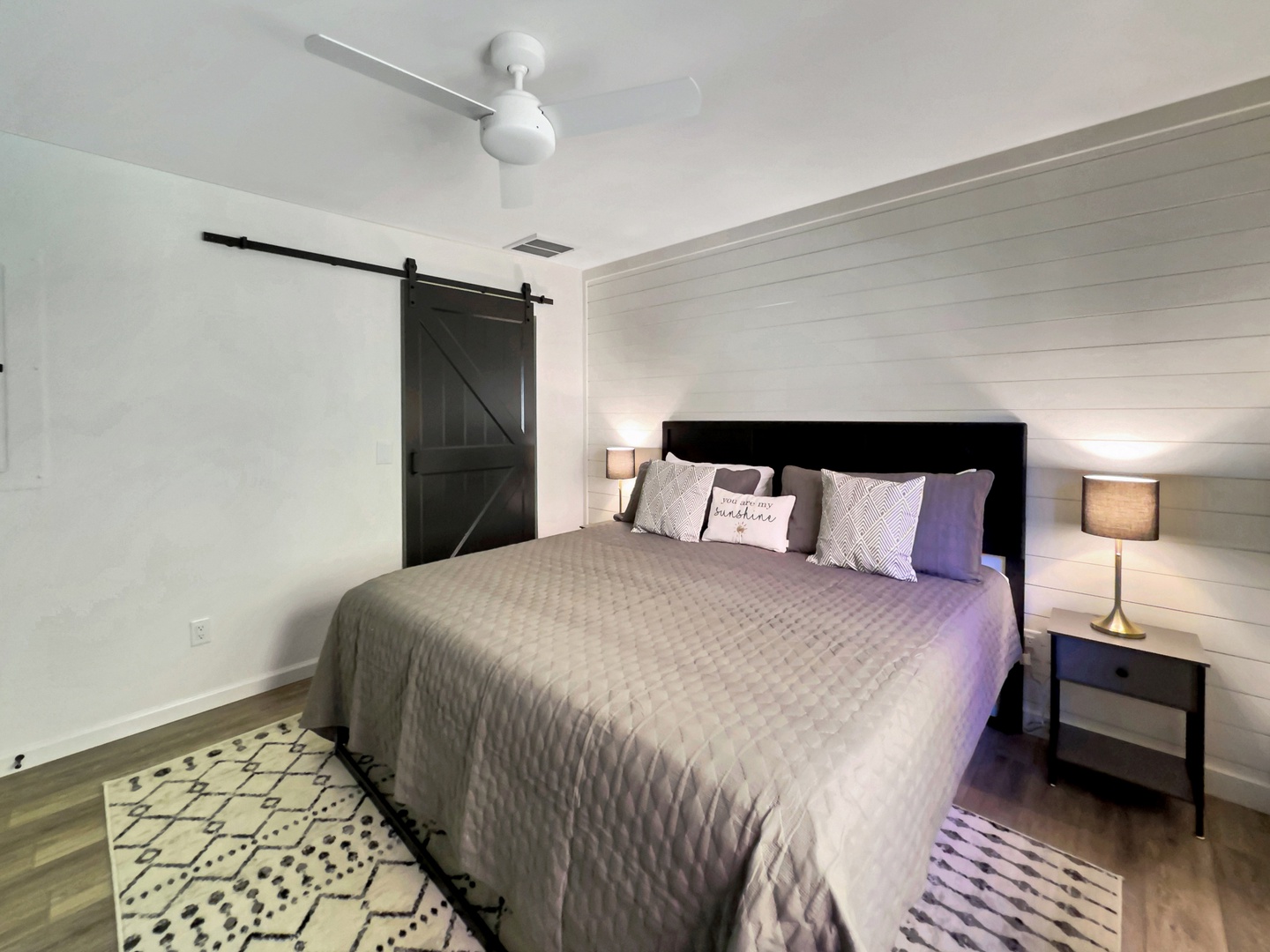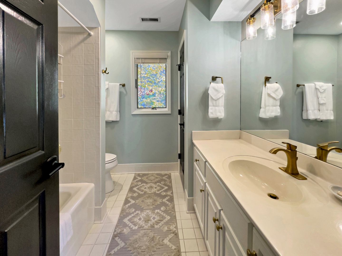 Guest Bedroom: King bed, flat-screen TV, easy access to a full tub/shower combo bathroom