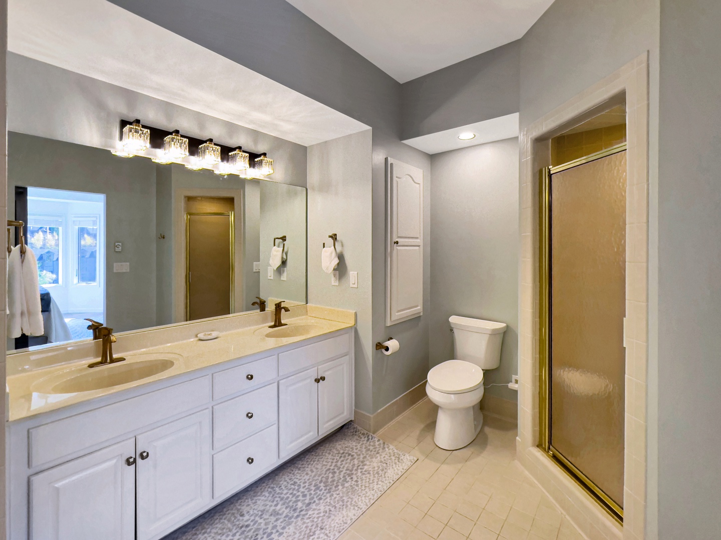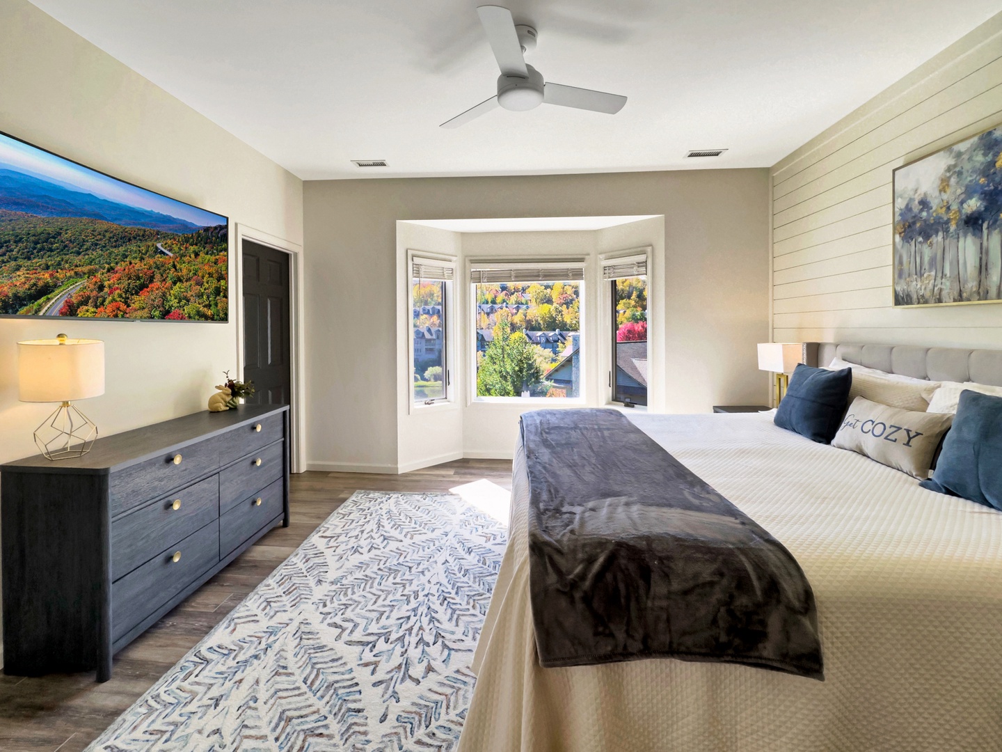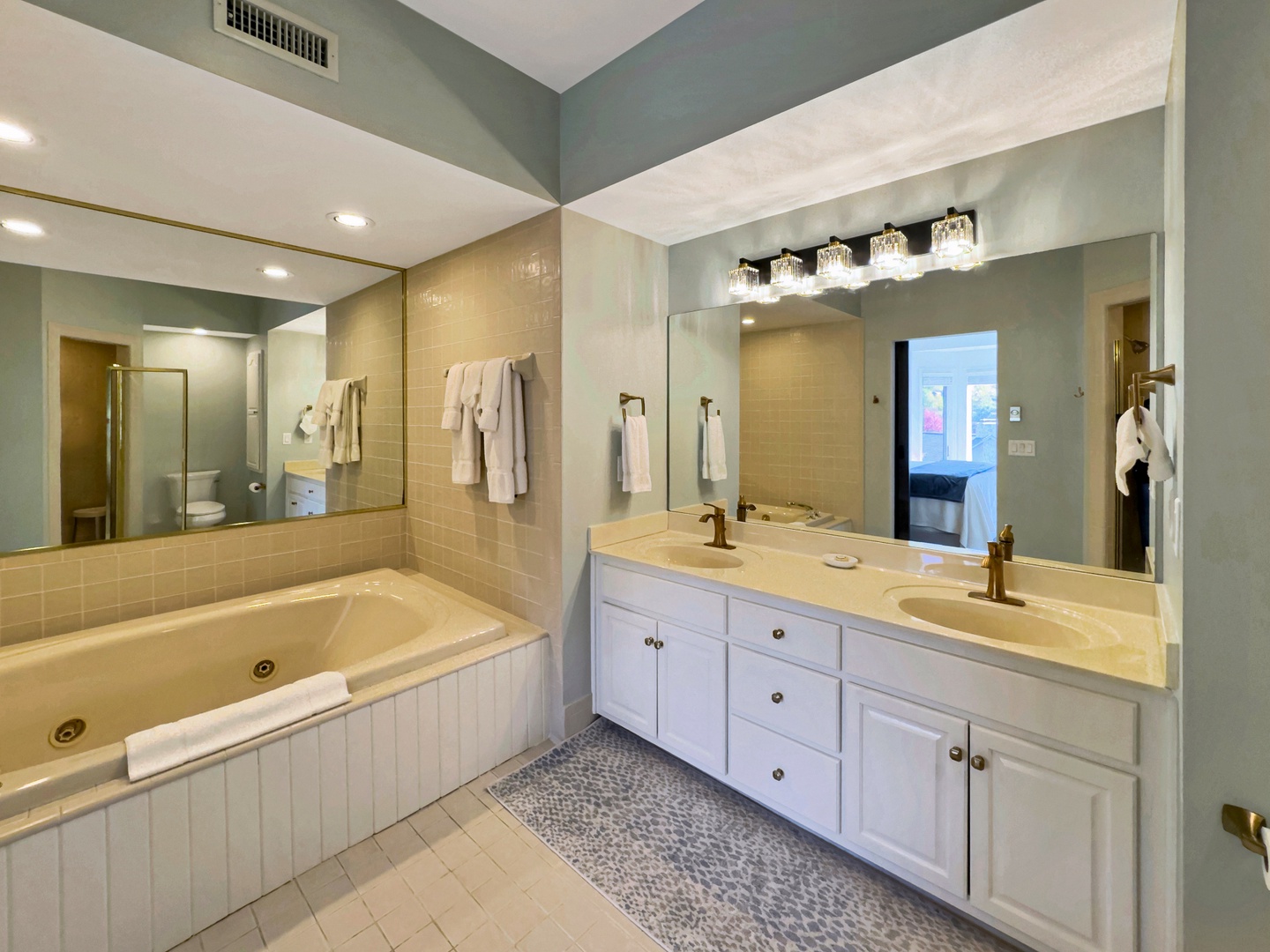 Master Bedroom: King bed, flat-screen TV, ensuite bath with 2-person whirlpool tub and walk-in shower