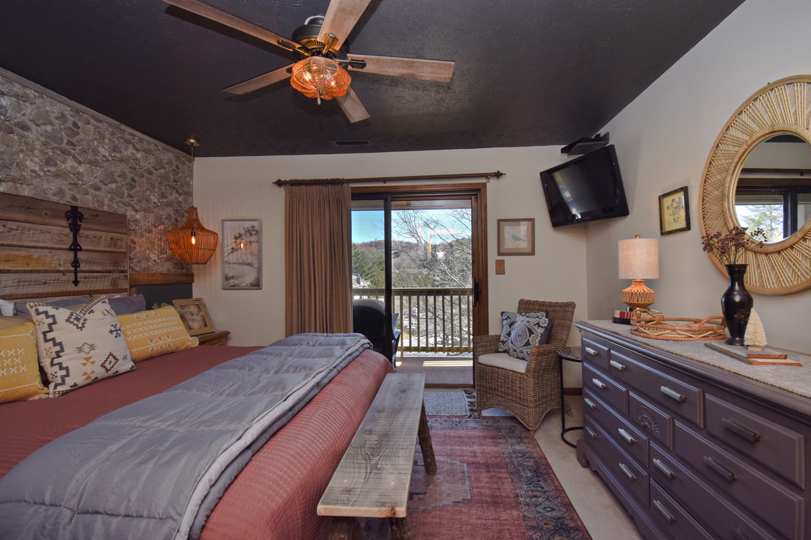 Primary Bedroom: King bed, cozy carpeting, flat-screen TV with Blu-Ray player