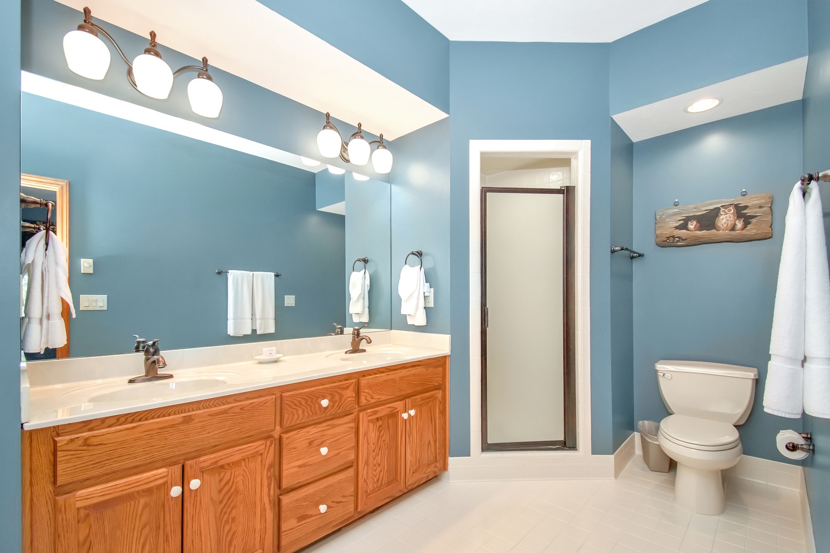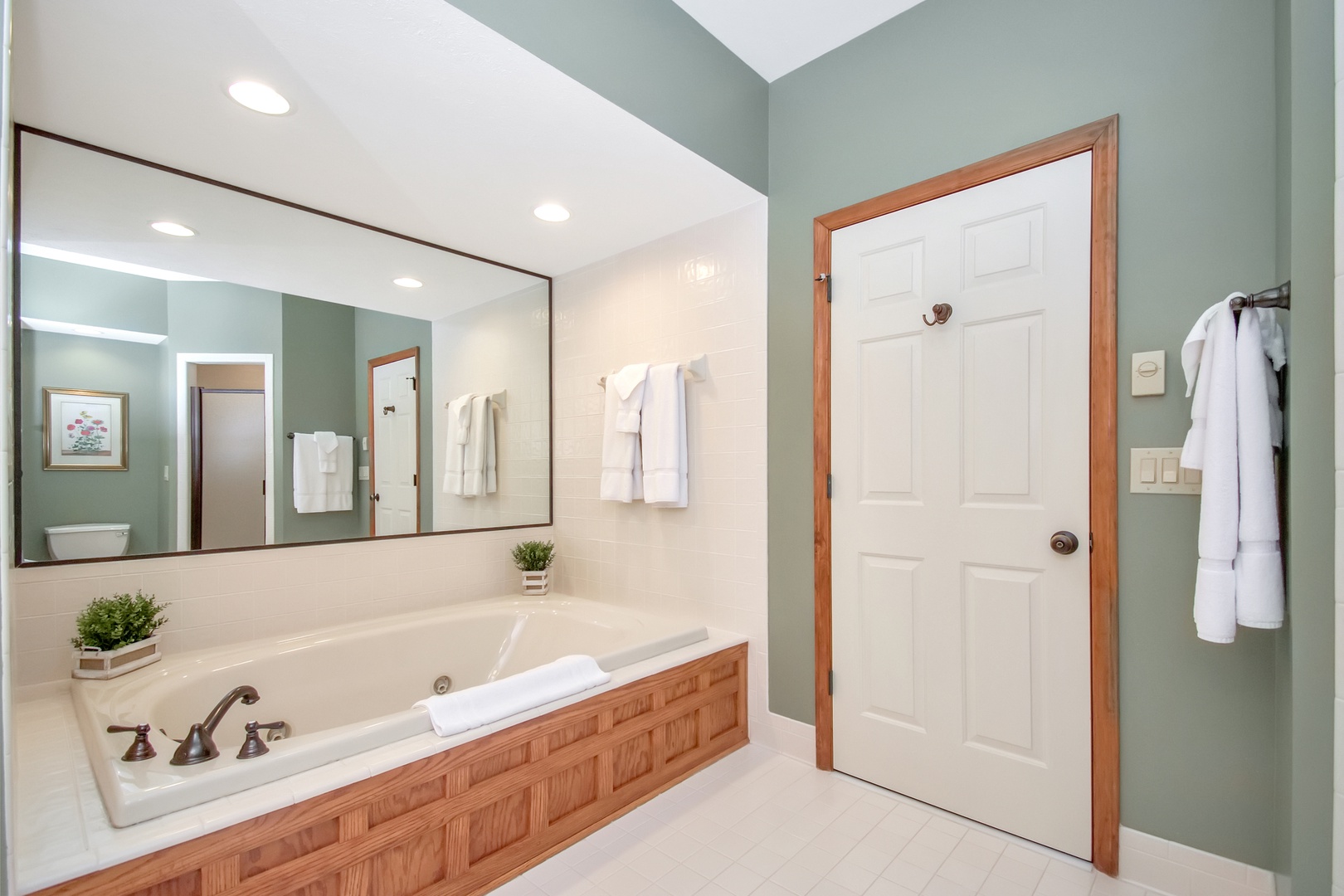 Primary Bedroom: King bed, flat-screen TV, en-suite bath with two-person whirlpool tub, standing shower, and dual vanities