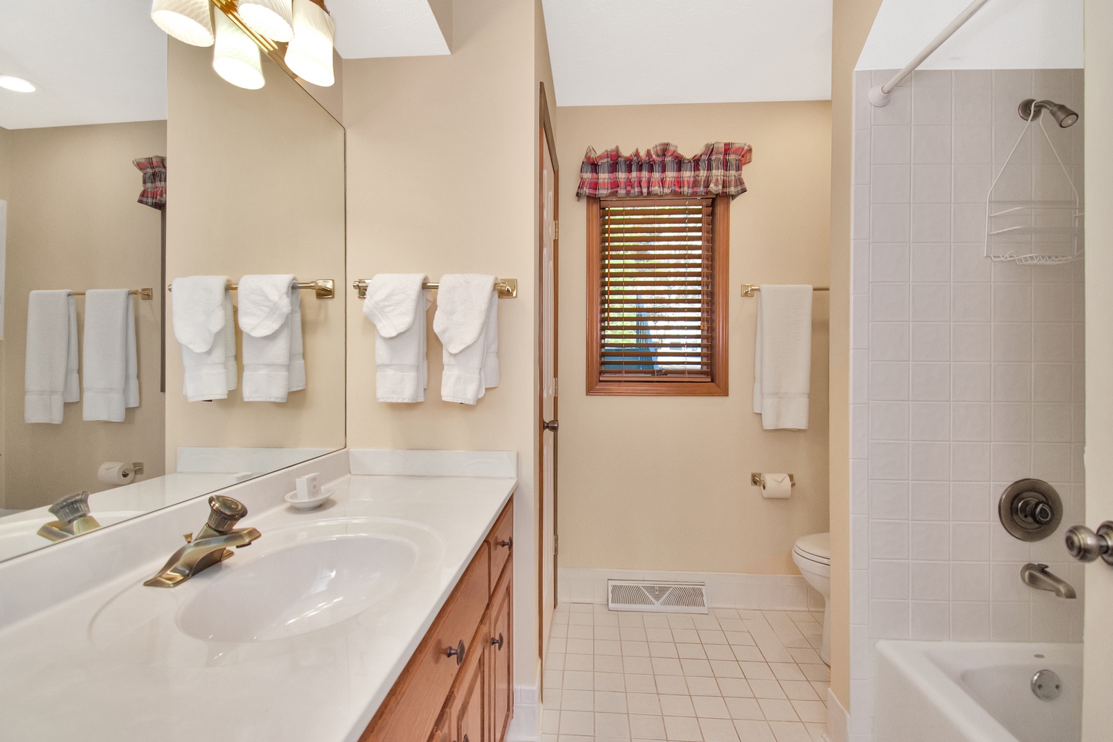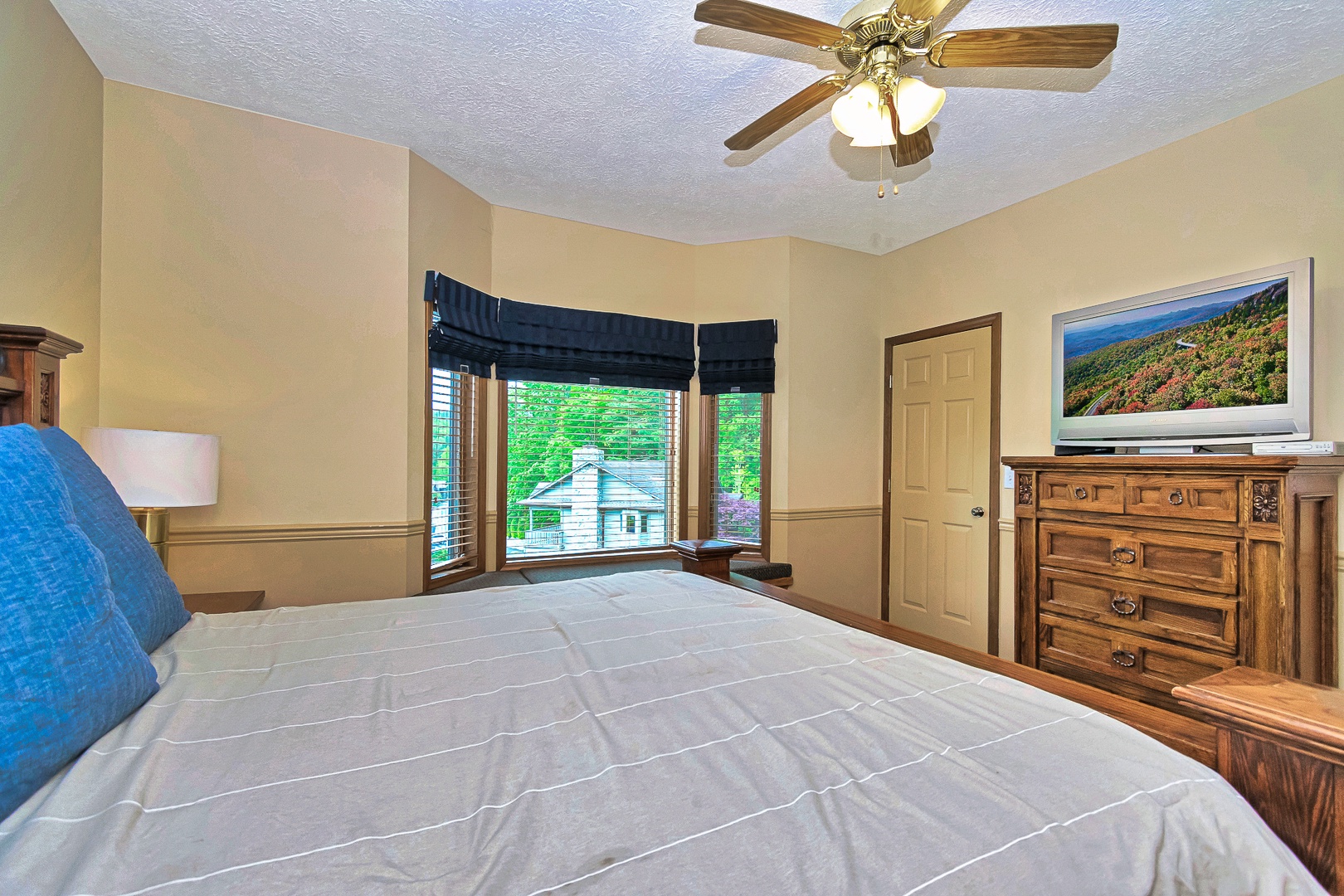 Primary Bedroom: King bed, flat-screen TV, en-suite bath with whirlpool tub and shower