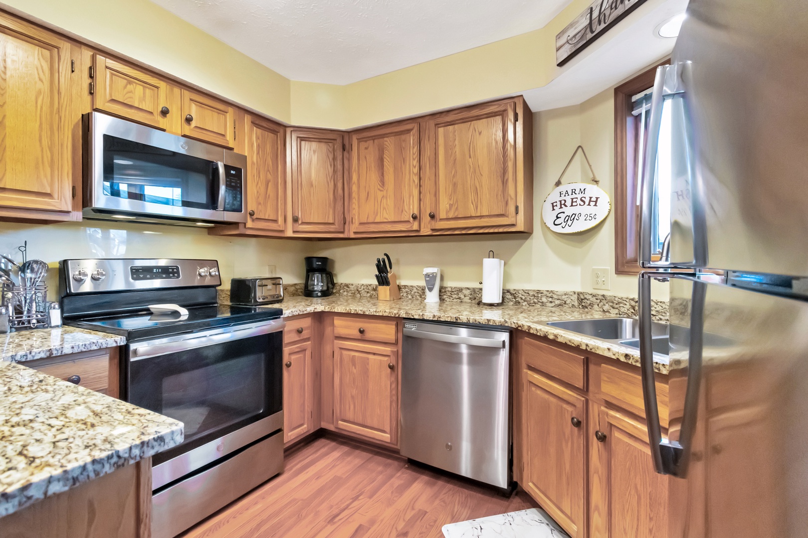 Full-size kitchen with granite countertops & stainless-steel appliances