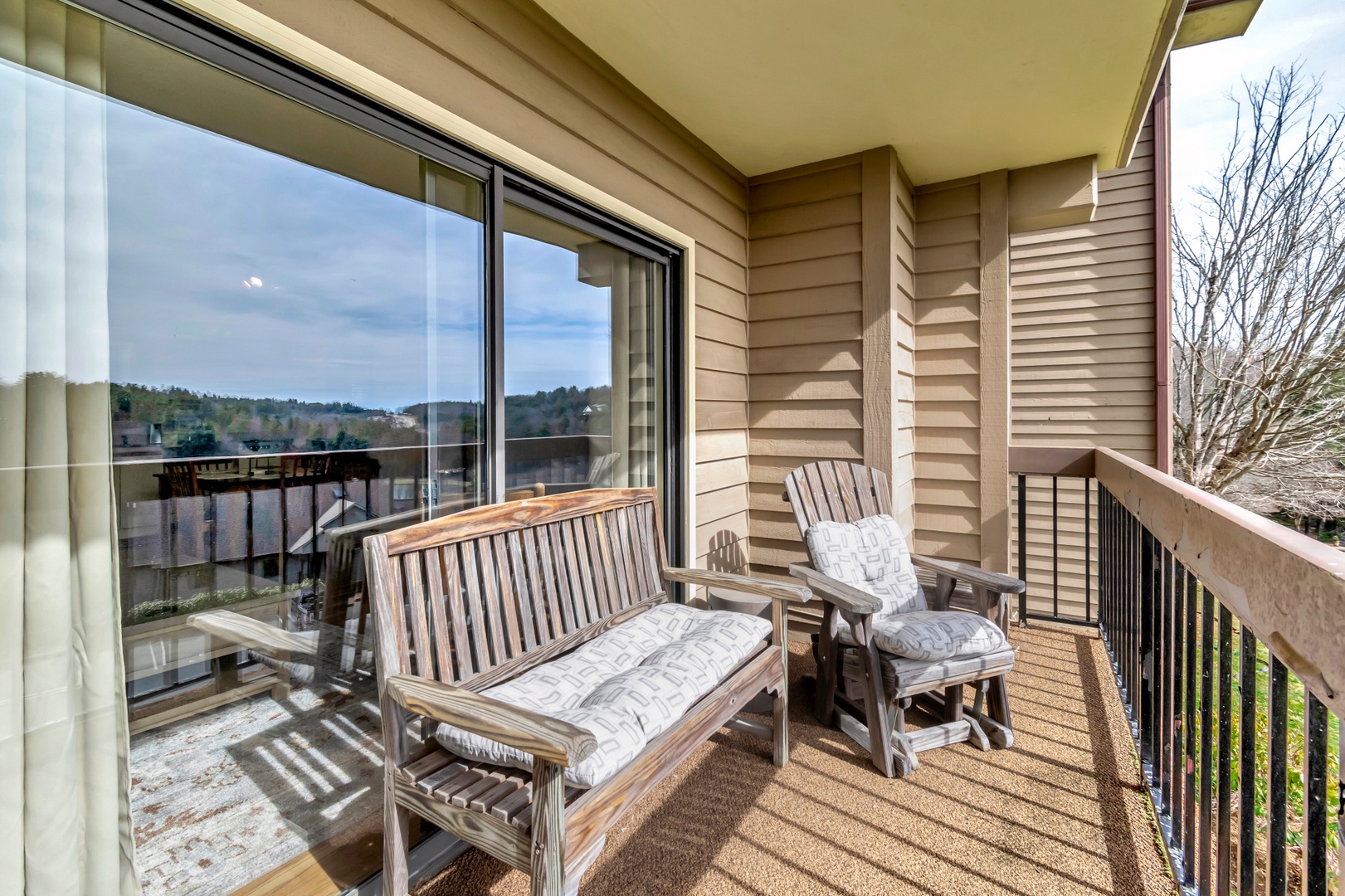 Balcony with comfortable park bench and slider rocker, perfect for relaxing and enjoying the views