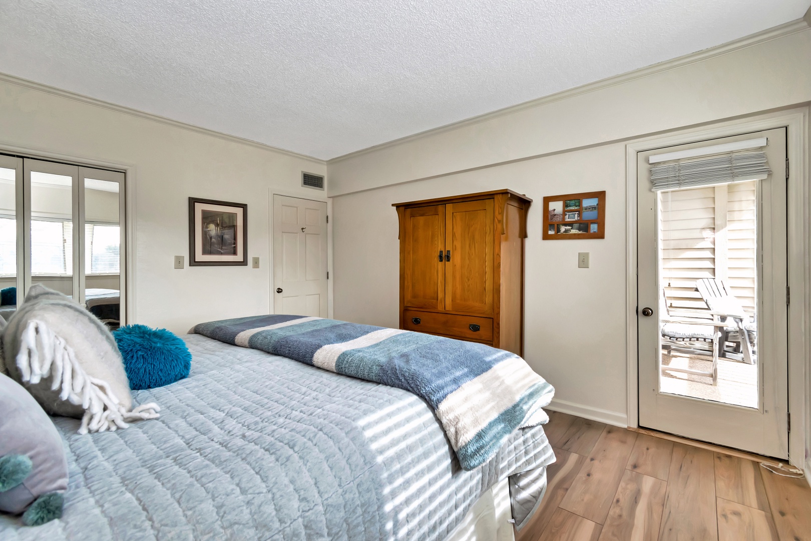 Primary Bedroom: King bed with 32" TV and balcony access