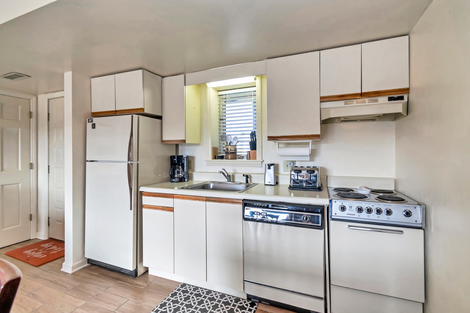 Efficient kitchen with full-size refrigerator, dishwasher, stove, and microwave